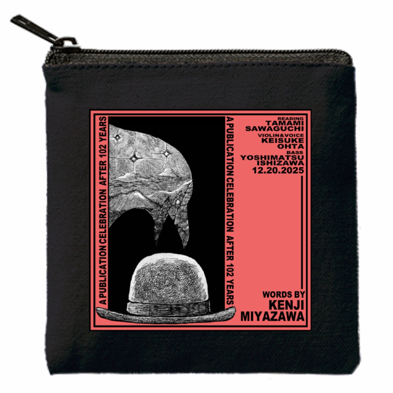 2025年12月20日、盛岡市バスセンター内の穐吉敏子jazzミュージアムで開催される宮澤賢治 朗誦伴奏 102年後の出版祝賀会を記念したオリジナルデザインのミニポーチです。